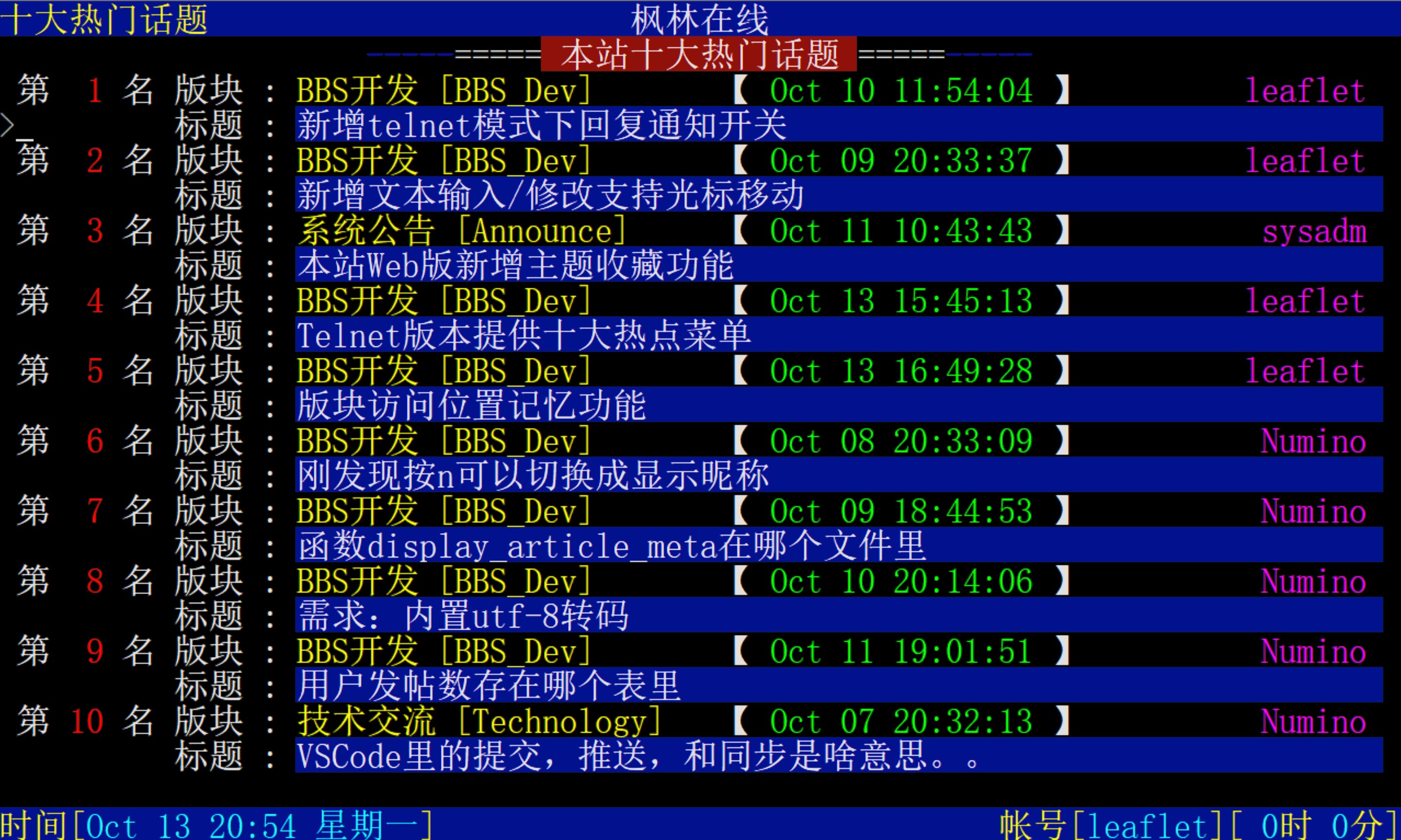 [472306] 主题: Telnet版本提供十大热点菜单 |