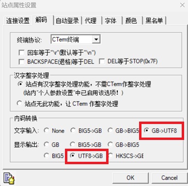 码功能。如果你选择UTF8编码(登陆时默认选项),则需要配置GBK<->UTF8的输入输出转换